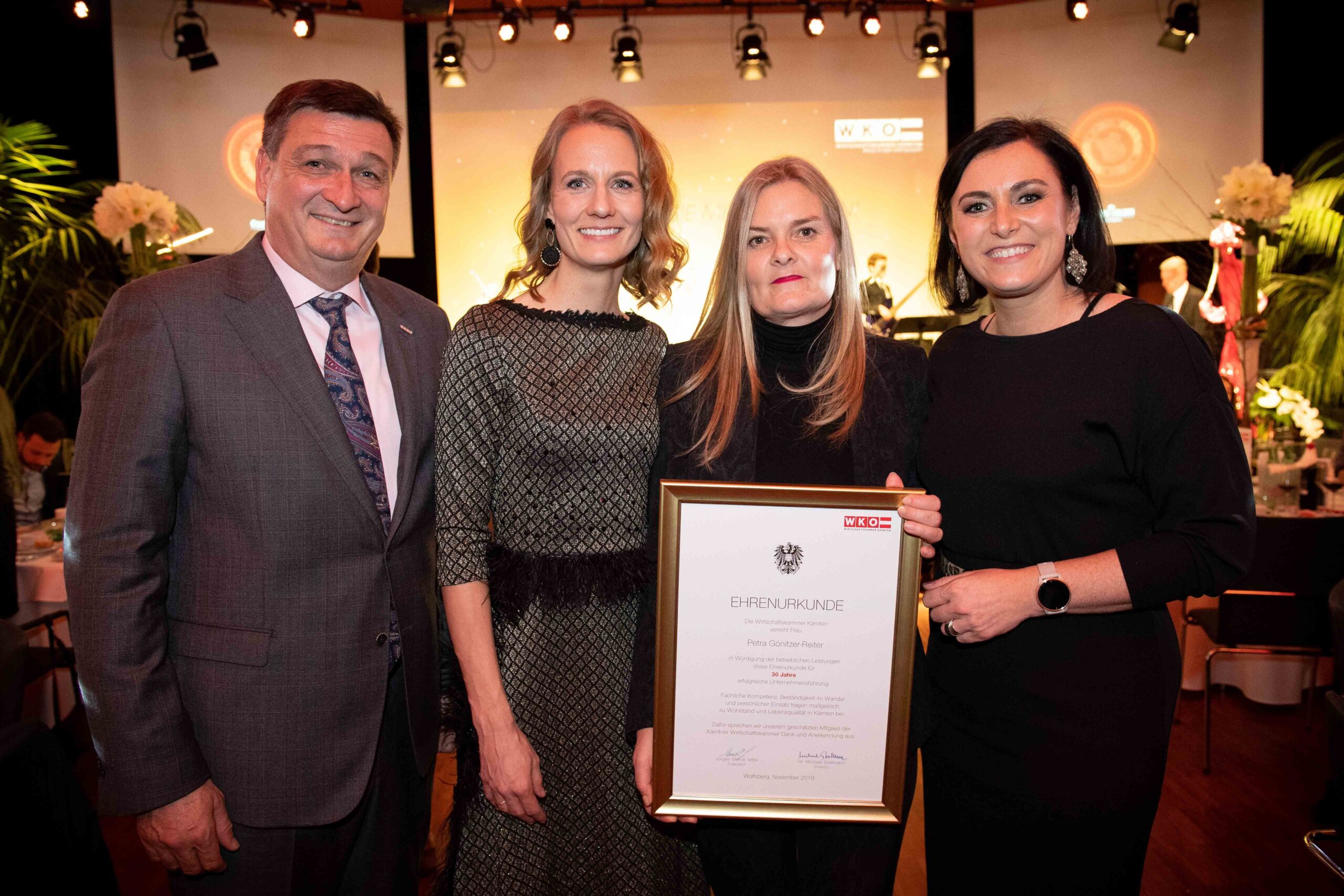 Feierliche Übergabe der Ehrenurkunde an Gönitzer-Reiter Petra im Casineum Velden im Rahmen der Gala Unternehmerin des Jahres für „30 Jahre erfolgreiche Unternehmensführung“ durch Wirtschaftskammerpräsidenten Jürgen Mandl, Vizepräsidentin Carmen Goby und Bundesministerin Elli Köstinger.